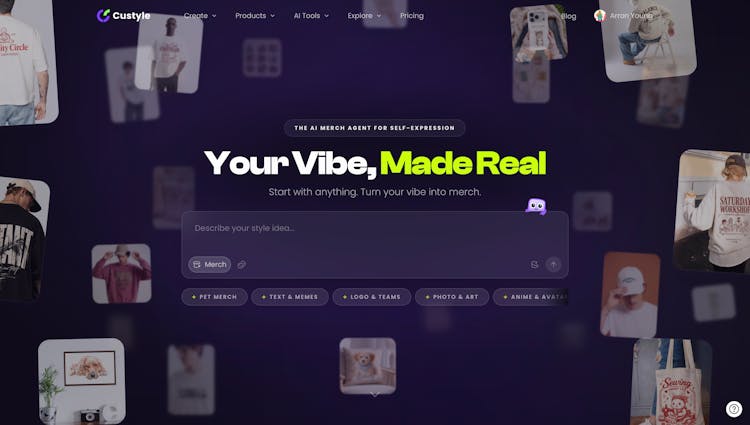 CUSTYLE.AI is the world's first AI Merch Agent. Describe a vibe — a memory, a meme, an aesthetic — and our 9-agent AI crew handles creative direction, design, manufacturing process selection & delivery. No design skills. No minimums. Hundreds of product types. Not printed on. Built for you.