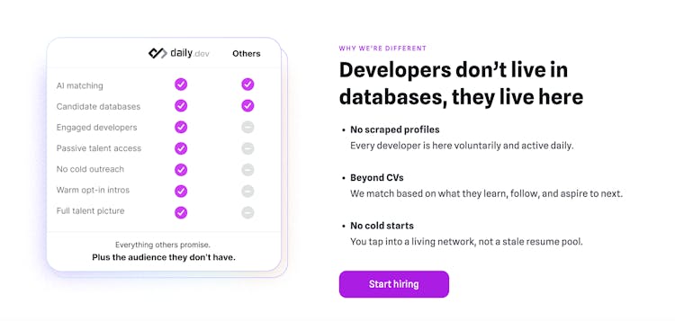 daily.dev recruiter connects companies with developers who actually want to hear from them. It taps into the daily.dev network, where millions of engineers learn and engage every day, and turns that real behavior into high-signal matches. Only developers who opt in, qualify, and show intent ever reach your inbox. You get faster, cleaner pipelines and trusted introductions that outperform traditional sourcing.