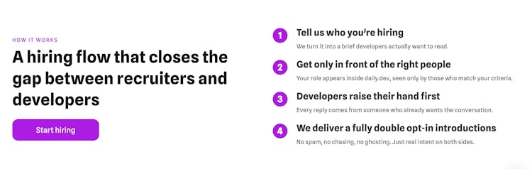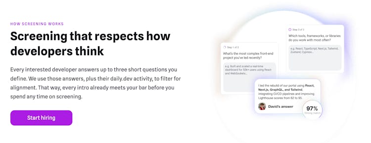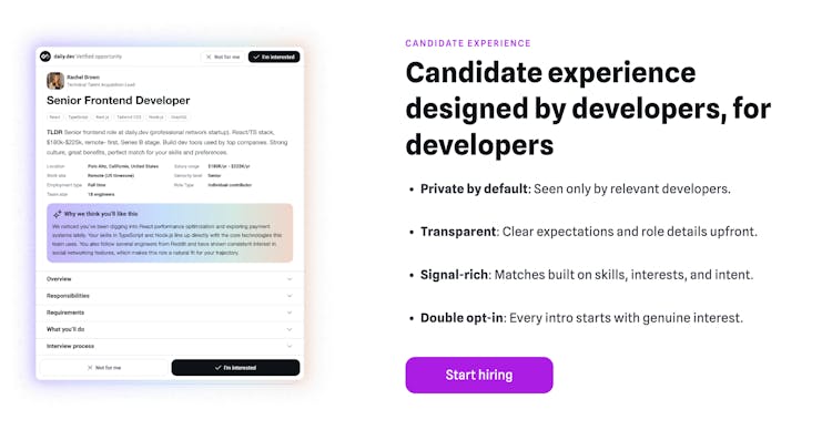 Developer-first recruiting that delivers high-signal, double opt-in matches from the daily.dev network.