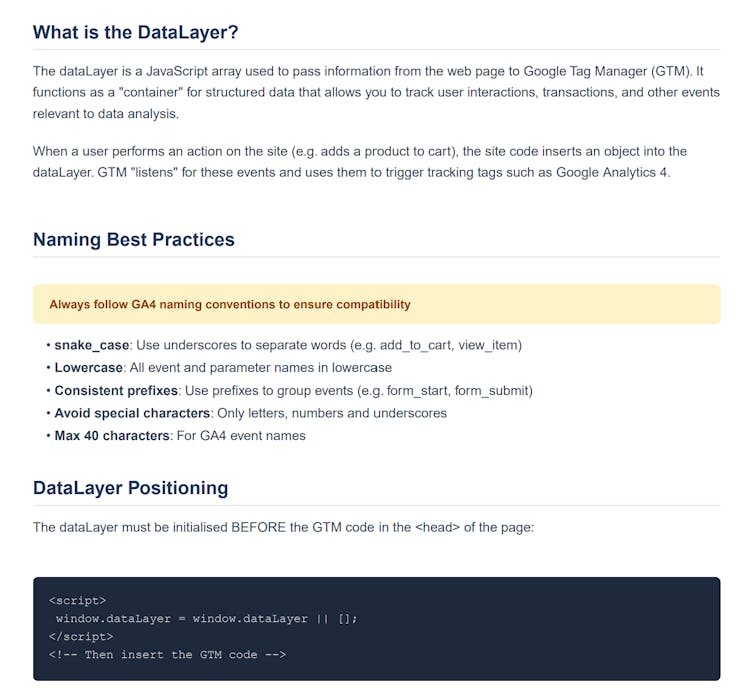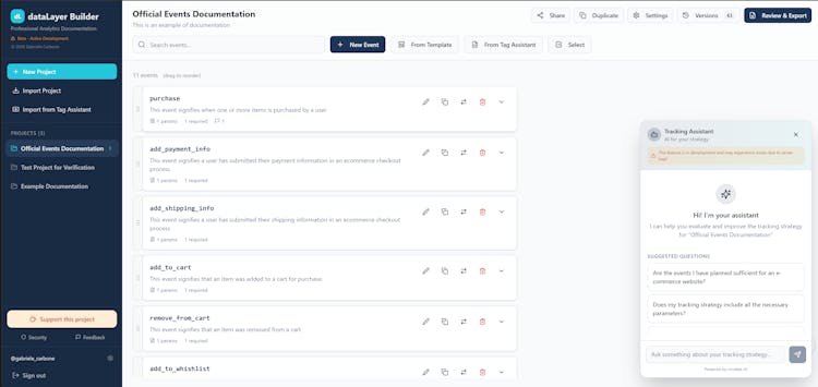 A free, web-based builder to create consistent analytics tracking specifications. Export to JSON, DOCx, PDF or Markdown. Import from existing implementations. Collaborate with your team.