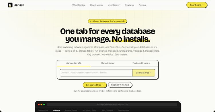 DBridge.dev is a browser-based database client that lets you connect, query, and manage multiple databases — Postgres, MySQL, MongoDB, and Firebase Firestore — all from a single tab. No installs, no context-switching, just easy access to your data and schemas.