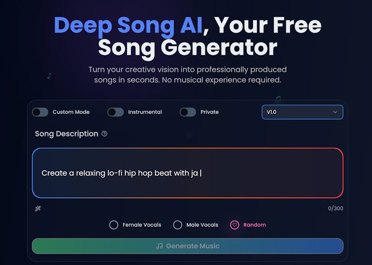 Create original and royalty-free songs with DeepSong.ai now! - a free online AI-powered platform for fast, high-quality song & music generator.