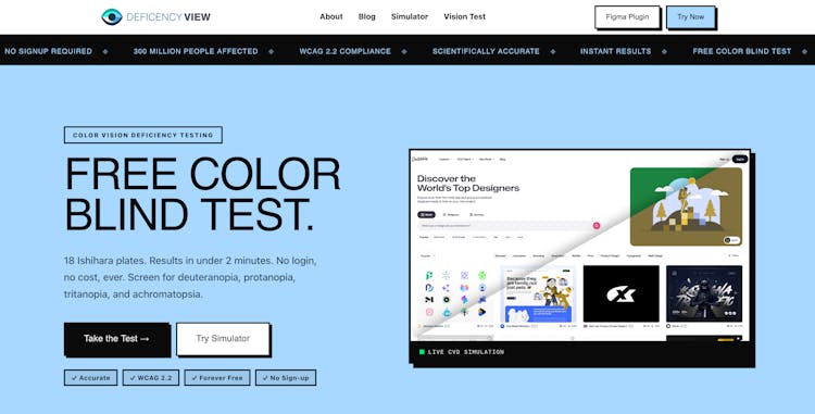 Free browser-based colour blindness test and simulator. Preview any image or website URL through deuteranopia, protanopia, tritanopia, and achromatopsia. No login required.