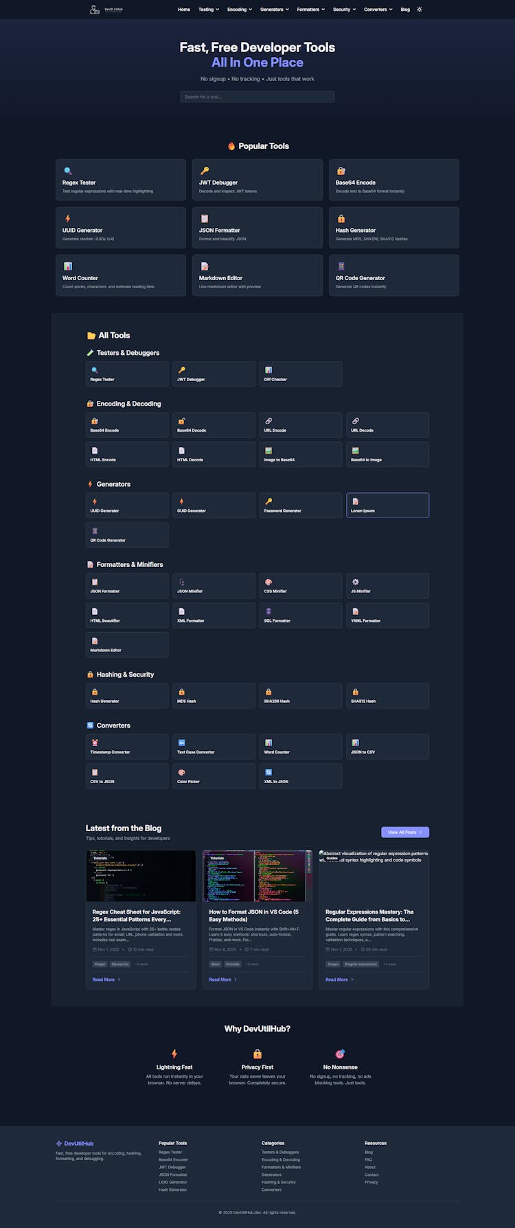 DevUtilHub is a collection of fast, privacy-focused developer tools that run entirely in your browser. We've built 30+ utilities for everyday coding tasks—from testing regex patterns and debugging JWT tokens to encoding Base64, formatting JSON, generating UUIDs, and creating secure hashes. No sign-ups, no data collection, just instant tools that work. Whether you're validating patterns, converting timestamps, minifying code, or generating QR codes, everything happens locally on your machine. It's the developer toolkit I wish I had bookmarked years ago.
