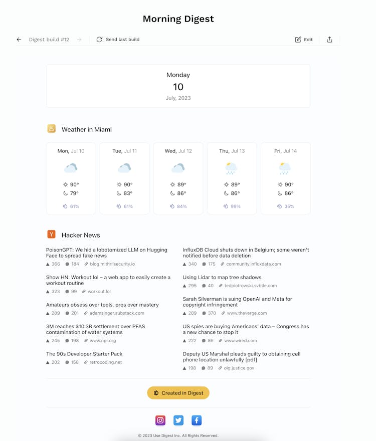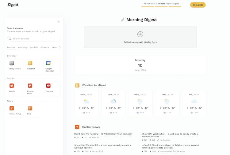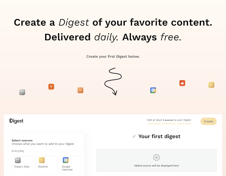 Create a personalized newsletter digest of your favorite content. You can pick and choose from various sources like Hacker News, RSS, Google Calendar, Weather, Reddit, YouTube, Product Hunt and more. Each day, week, or month you'll receive your digest via email.