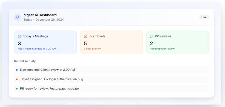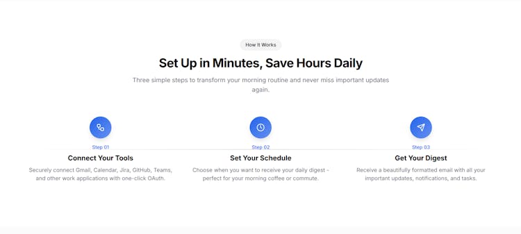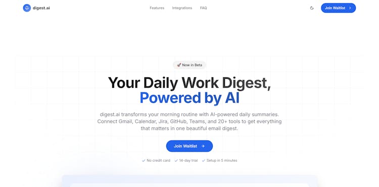 Transform your morning routine with digest.ai. Get AI-powered daily summaries of all your work notifications from Gmail, Slack, Jira, GitHub, and 20+ tools in one beautiful email digest.