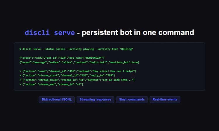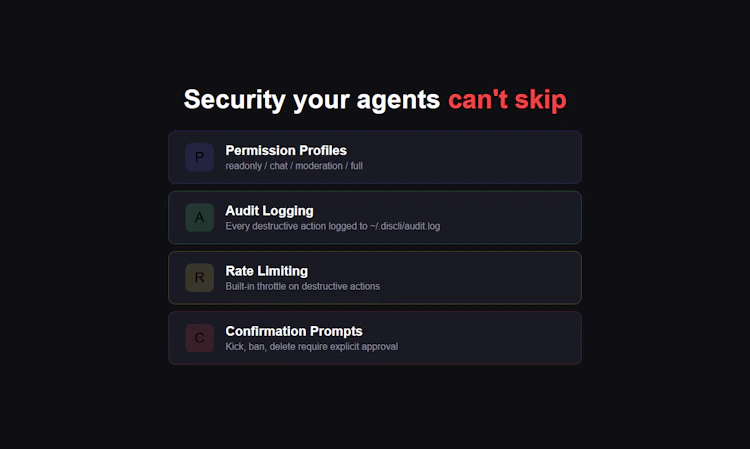 Give your AI agent a Discord account. discli lets agents send messages, react, manage threads, moderate — all from the terminal. Built with permission profiles, audit logging, and rate limiting so agents can't go rogue. Works just as well for humans who want to script and automate Discord without a GUI.