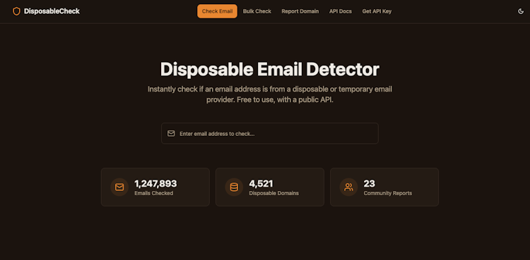 🚀 DisposableCheck API helps you detect disposable and temporary email addresses before they pollute your user base.