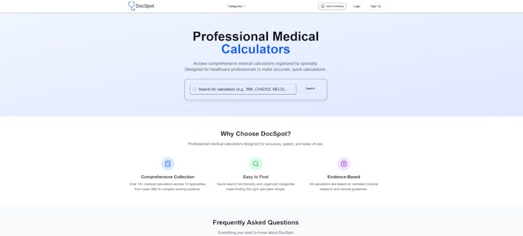 Medical calculators are scattered across different websites with different formats and are only available offline. Doc Spot uses a standardized template for all calculators to make them extremely quick and efficient and allows you to use our website offline seamlessly.