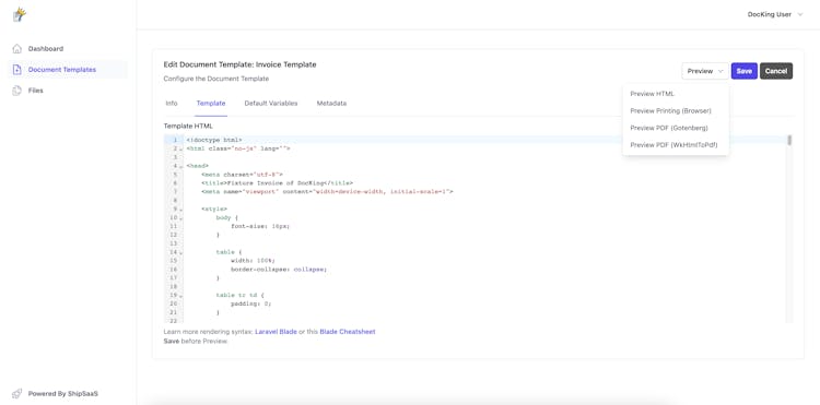 DocKing is a document management service/microservice that handles templates and renders them in PDF format, all in one place.