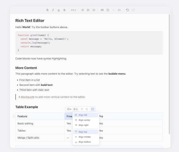 A lightweight, extensible rich text editor toolkit built on ProseMirror. Framework-agnostic headless core with first-class Angular support.