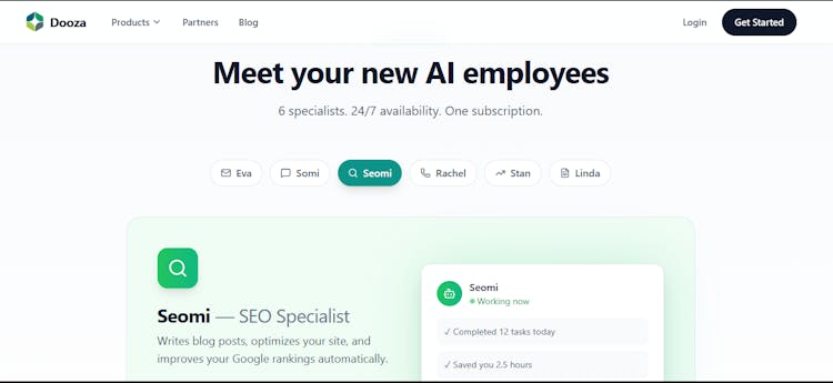 Cleo — Customer Support Rep. Email and ticket triage, intelligent responses that match your brand voice, FAQ resolution, escalation routing. The core of Dooza's origin story — support done right without Zendesk pricing.