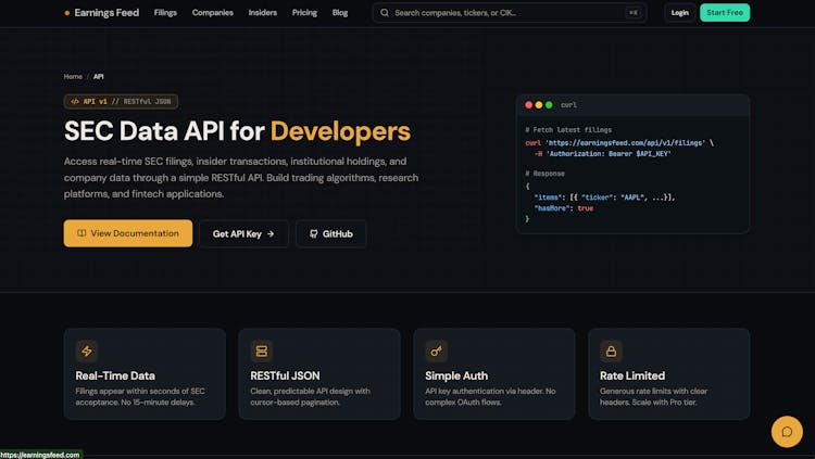 REST API for SEC filings data. Query public company info, fetch filings (10-K, 10-Q, 8-K, Form 4), and track insider trades by ticker or CIK.