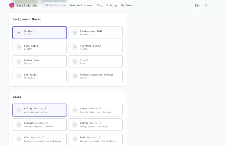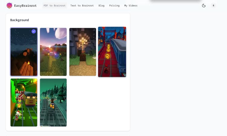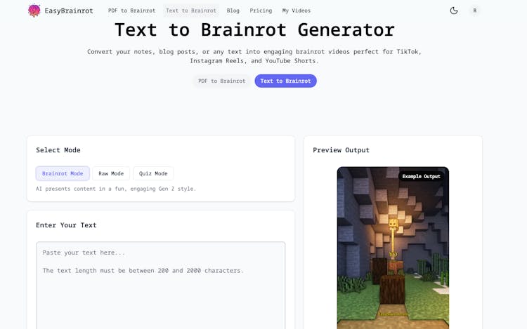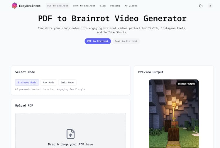 EasyBrainrot transforms boring PDFs and text into engaging "brainrot" style videos - the viral TikTok format with educational voiceovers over Minecraft parkour or Subway Surfers gameplay.