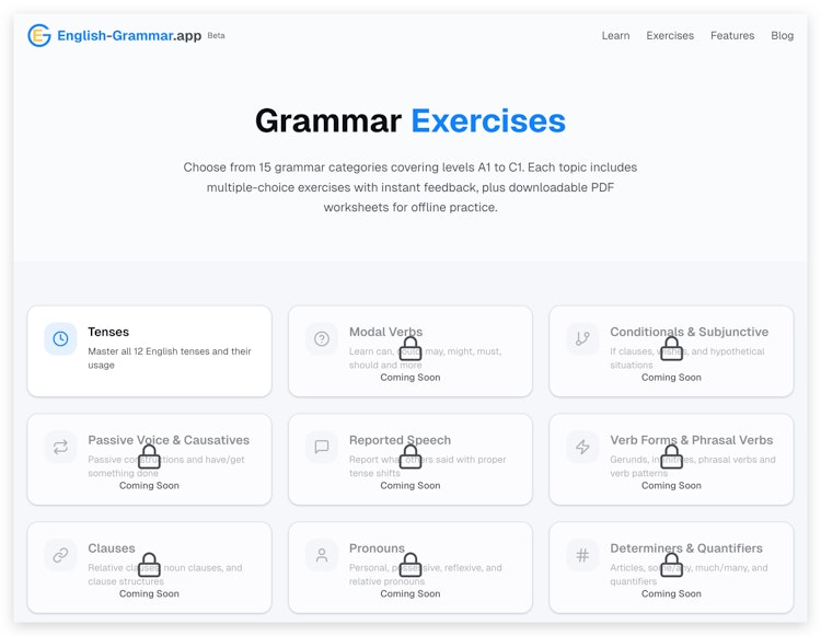 Free interactive grammar exercises for learners worldwide. Practice tenses, conditionals, modal verbs, and more with instant feedback.