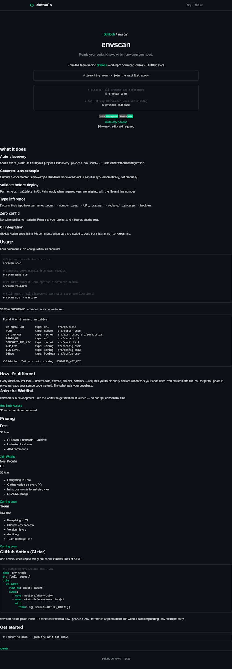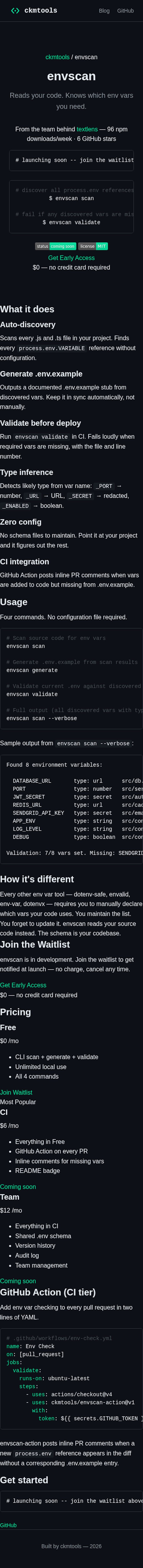 CLI tool that finds every process.env reference in .js/.ts files. Generates .env.example with type hints. Validates all vars are set before deploy. Zero config. GitHub Action CI tier posts PR comments when new env vars appear without .env.example entries. In development.