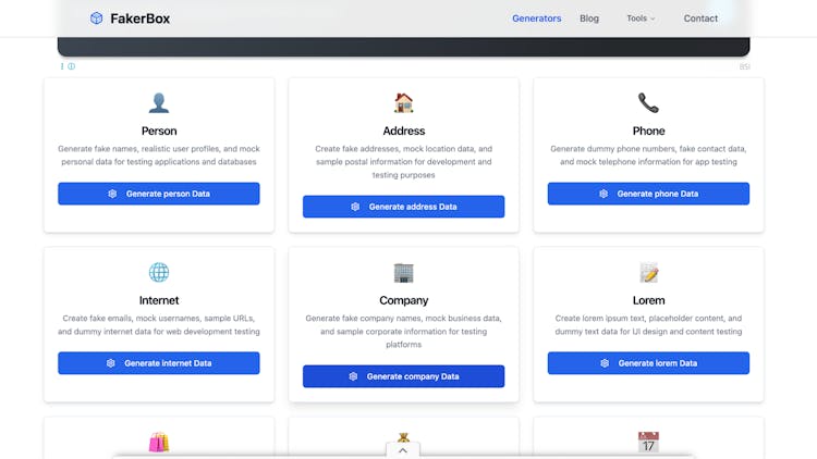 Fakerbox is a free and effortless data generation tool built for developers, designers, and testers. No prompts, no complexity, just land on the site, pick the tool you need, and generate data instantly with a single click.