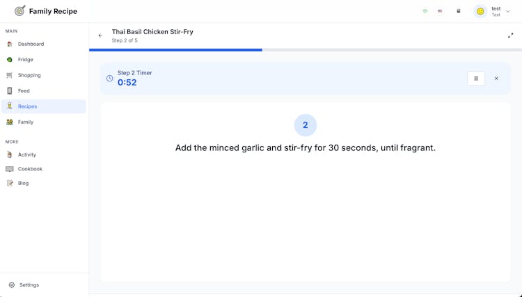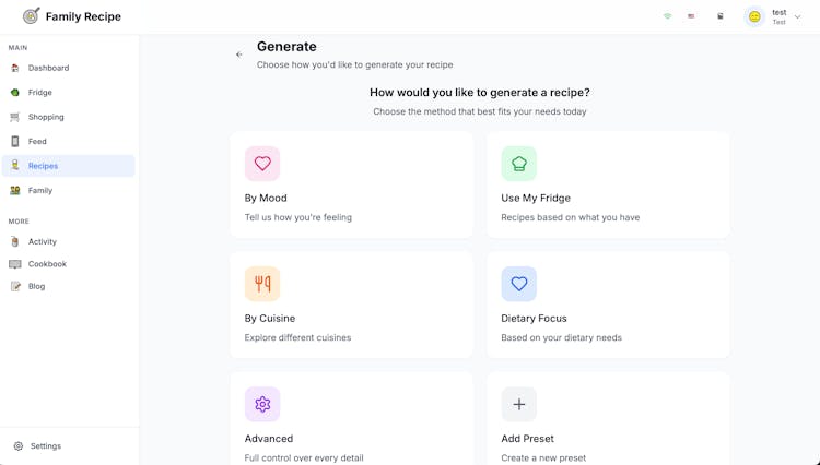 Quick note on how it works: you start by setting up your preferences (skills, cuisine interests, allergies, etc.). Then you can generate recipes using AI depending on your mood: lazy, feeling fancy, only using what’s in your fridge, or something more advanced (sweets, main dish, starter, drinks, etc.). Add missing ingredients to your shopping list and, once bought, to your family fridge. You can share recipes with family members, create a family cookbook and download it, and follow instructions in a cooking mode easily!