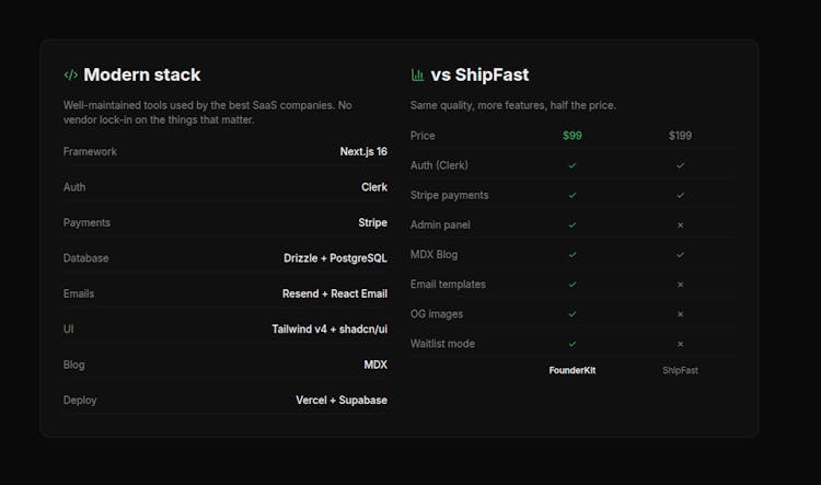 admin panel with MRR stats, OG image generation, and waitlist mode. One-time $99 — no subscriptions.
