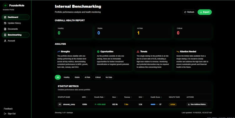 FounderNote is a startup reporting and investor update platform that helps founders share structured updates effortlessly while giving investors real-time portfolio intelligence. Instead of scattered emails, Word docs, spreadsheets, or WhatsApp notes, FounderNote standardizes metrics, KPIs, and progress reports into a clean, comparable format. Investors get a unified dashboard with insights, benchmarks, and early risk detection. By improving founder–investor communication, FounderNote increases transparency, alignment, and portfolio performance.