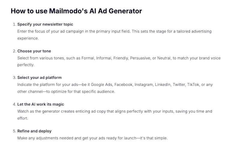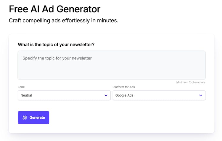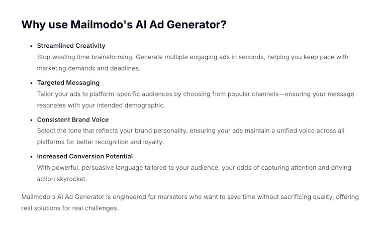 - Instant ad copy generation based on your product and audience