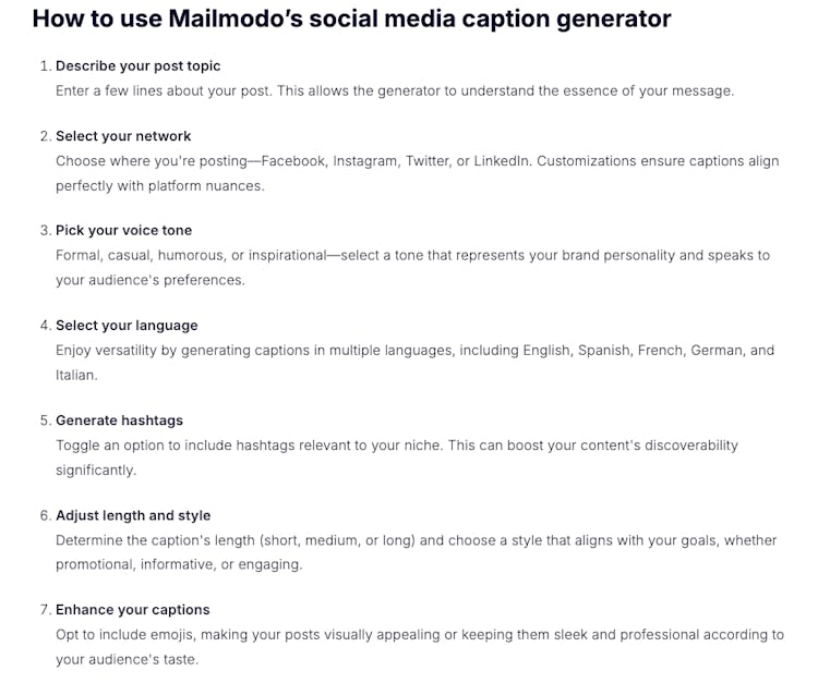 Mailmodo’s Social Media Caption Generator turns your ideas into scroll-stopping captions in seconds. Just enter your topic, choose a tone and platform, and the AI crafts engaging, on-brand social copy that resonates with your audience. It helps you beat writer’s block, save time and keep your feeds fresh and consistent across Instagram, Facebook, LinkedIn, Twitter and more — perfect for creators and marketers who want captions that connect.