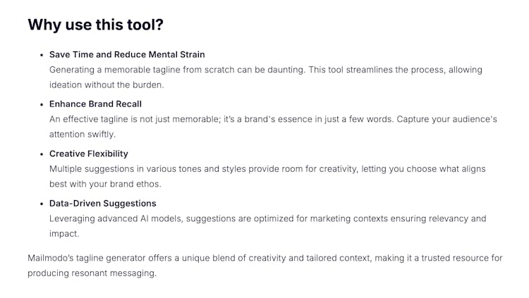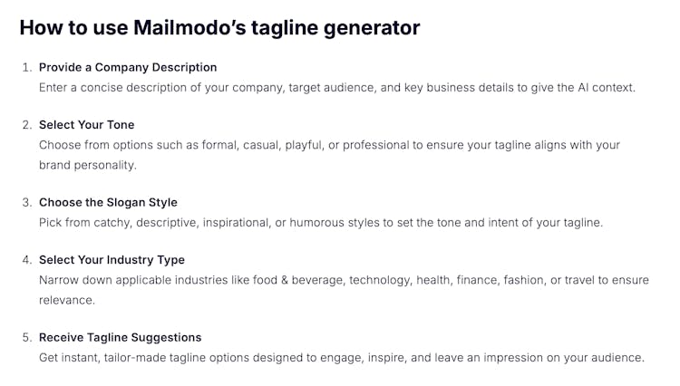 Mailmodo Tagline Generator turns your brand details into memorable, catchy taglines in seconds. You simply enter a short description of your company and pick the tone, style, and industry. The AI then delivers multiple tagline suggestions, making it easy to find one that matches your brand voice and message.