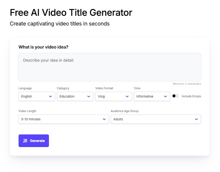 Mailmodo’s Video Title Generator helps you create catchy, high-impact titles that make your videos stand out instantly. Just enter your topic and the tool generates compelling, click-worthy title ideas designed to grab attention and boost visibility. It saves time, removes guesswork and helps your videos attract more views across platforms like YouTube and social media.