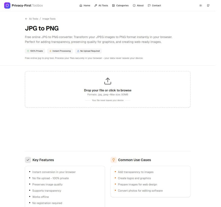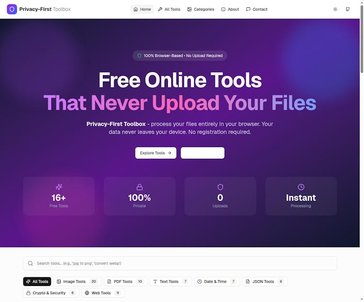Privacy First Toolbox offers 100% browser-based utilities for PDF merging/splitting/compressing, image conversion, and more - no server uploads, zero data tracking. Perfect for devs and users prioritizing privacy in everyday file tasks