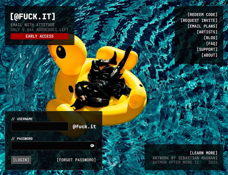 [@fuck.it] is an invite-only email service with no ads, no tracking, and a domain that makes every message a statement. Built on enterprise-grade tech, it features IMAP/SMTP support, encryption via OX Guard and rotating digital art on login. It's not just email - it's a fuck-it-level upgrade for your digital identity.