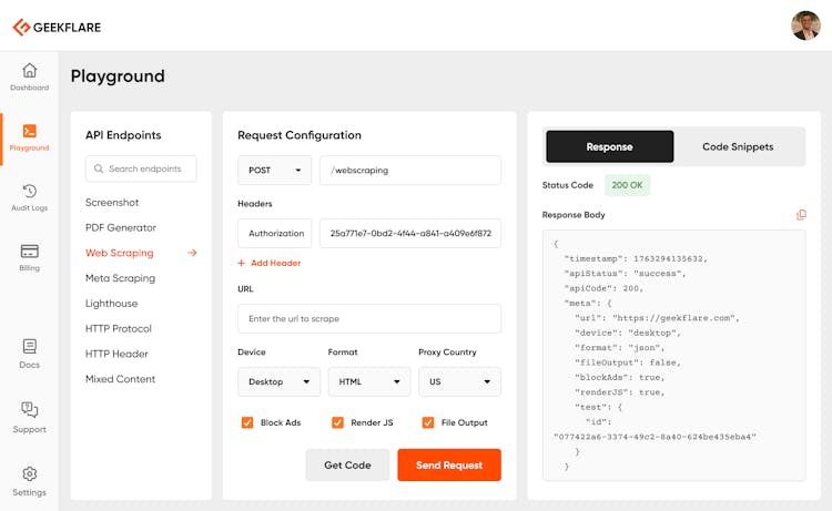 Scrape websites, take screenshots, run Lighthouse audits, scan TLS configs, check broken links, and many more with the Geekflare API.