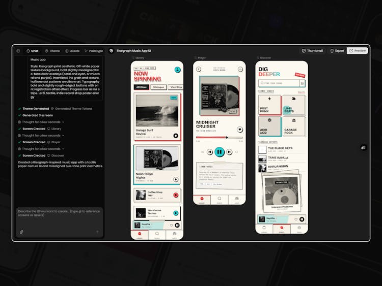 Key differentiator: automatic theme consistency. Describe your brand once, and every generated screen maintains the same visual language. Dark mode? Generated automatically. New screens? Inherit the established palette.