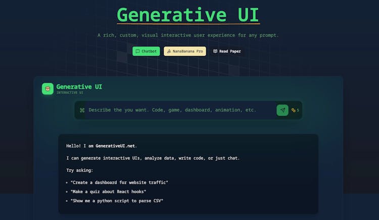Generative UI turns plain prompts into fully interactive, visually rich, purpose-built digital experiences. From dashboards to learning modules and custom apps, it dynamically adapts to each user’s intent, delivering real-time, intelligent, and personalized interface generation.
