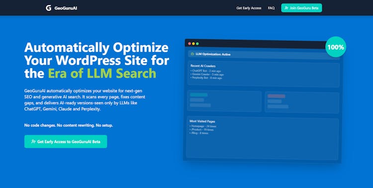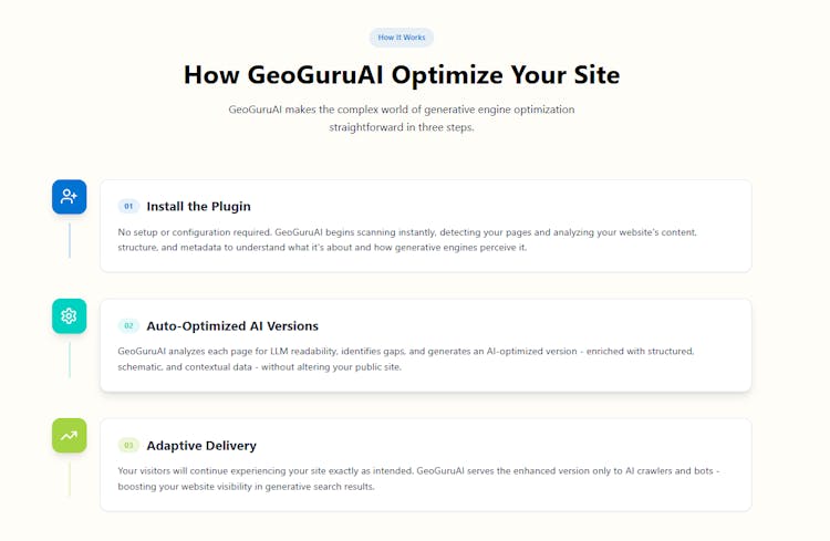 GeoGuruAI is a WordPress plugin that makes your site visible to both search engines and generative AI like ChatGPT and Gemini.