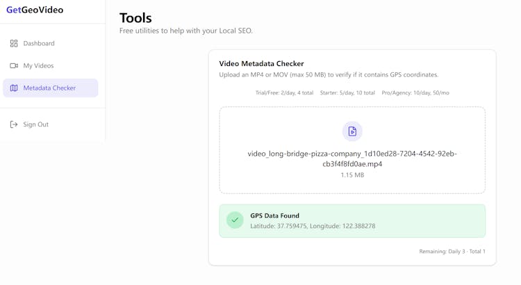 * **Validation:** Includes a built-in "Metadata Checker" to verify if files are readable by Google's algorithm.