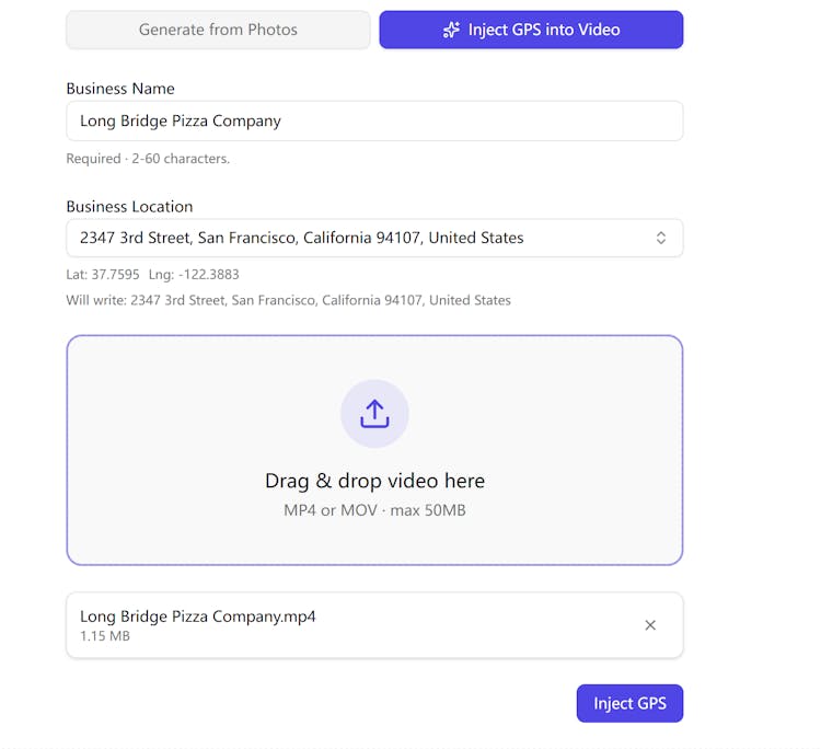 * **Metadata Injection:** Writes standard Exif and XMP location tags directly into .mp4 files.