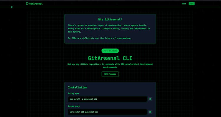 Why did I build this? Because I was tired of brilliant ideas dying in dependency hell. Last year, I was working on multiple research repos. What should have been 5 minutes of exploration turned into 3 hours of debugging CUDA versions, Python conflicts, and missing dependencies. Sound familiar? What's unique about our approach: - We don't just install packages - we understand the entire codebase using AI and predict what will break - Unlike coding assistants that help you write code, we focus purely on the unglamorous but critical job of getting existing code to actually run - We provision the right hardware automatically - no more "this needs a GPU" surprises - Our agent doesn't give up. It keeps debugging until your code works, just like a determined human would What I'm most proud of: We've tested this on 100+ repos ranging from simple web apps to complex ML research projects. Watching someone go from frustrated to coding in minutes instead of hours never gets old. The future where you can try any open-source project without setup friction is finally here. No more bookmarking repos "to try later" and never actually doing it.