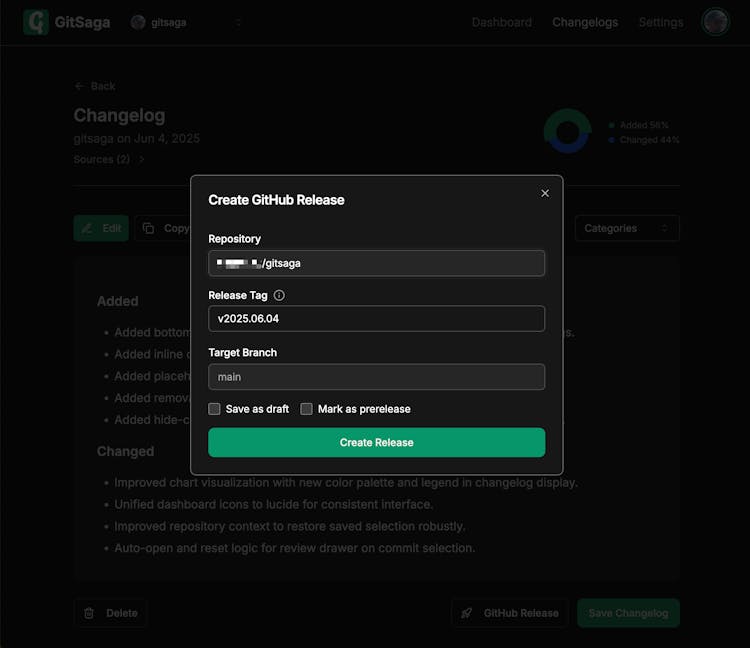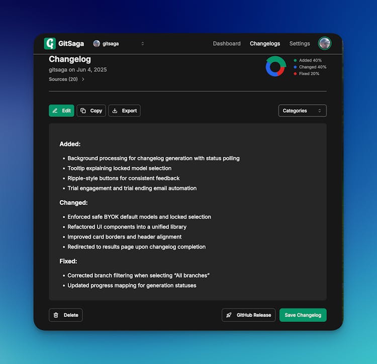 GitSaga automatically generates changelogs from your Git commits using AI and publishes them to GitHub Releases.