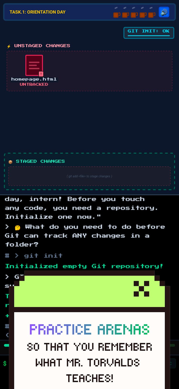 Git Set Go is the ultimate coding game for learning Git commands. You play as the new intern at Git Inc. under the mentorship of Mr. Torvalds. Your mission: survive 30 Git missions by typing actual commands to master version control.
