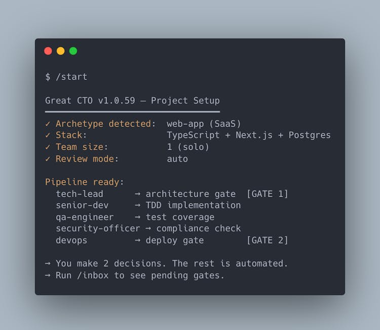 Claude Code plugin that runs your engineering process: 7 specialized agents handle architecture, code review, QA, and security. You make two decisions per feature - the rest is automated. Includes 12-angle review, 10 archetypes, 13 compliance frameworks. MIT.