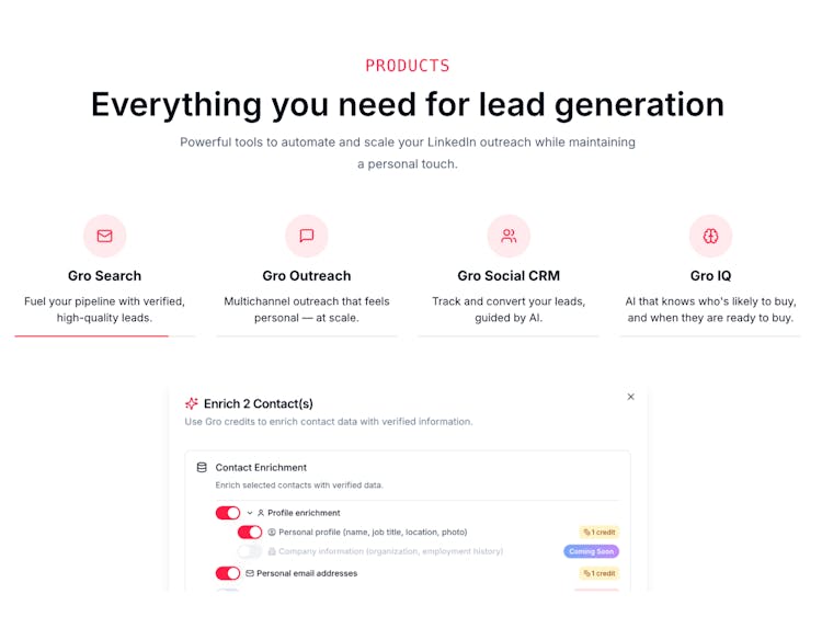 Gro is an AI-driven sales automation platform that unifies prospecting, outreach, and pipeline building in one intelligent system. With access to a live 1b+ contact database, AI-powered propensity scoring, and automated multi-channel sequences, Gro helps sales teams focus on high-impact accounts and close deals faster. The platform eliminates fragmented sales stacks by connecting lead generation, enrichment, LinkedIn and email outreach, intent tracking, and CRM functionality in a single workspace. No exports, no manual data hunting, just clean data and precise outbound execution.