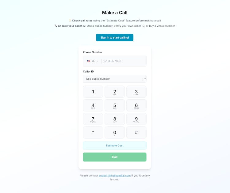 HelloAirDial is a browser-based international calling service that lets you call real phone numbers worldwide without SIM cards, or calling cards.. The app offers pay-as-you-go rates starting from $0.02/minute, and no subscriptions or contracts. Users can try it with a free 1-minute call (no credit card required). The app allows users to call mobile and landline numbers in 200+ countries with no app-to-app restrictions. Users can also customize their caller ID by verifying their personal number or purchasing a virtual number (US/Canada available). HelloAirDial does not require users to have a phone number, they can use a pre-assigned virtual number to make calls. Communication is encrypted and data is protected. HelloAirDial is built for expats, freelancers, digital nomads, and small businesses who need reliable international calling. Skip calling cards and complex VoIP apps and use HelloAirDial for simple, transparent calling.