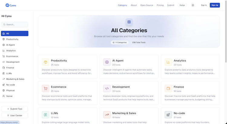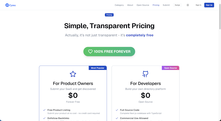 Hi Cyou makes your directory smarter! This modern open-source platform is powered by AI to auto-categorize sites and generate content, with built-in semantic search for pinpoint discovery. User submissions are auto-verified via backlink checks, saving you time. Built with Next.js 14 and Tailwind, it’s fast, easy to deploy, and fully customizable—perfect for SaaS founders and developers to discover or showcase tools. Open source, self-hostable, and commercially usable—it’s your smart directory.