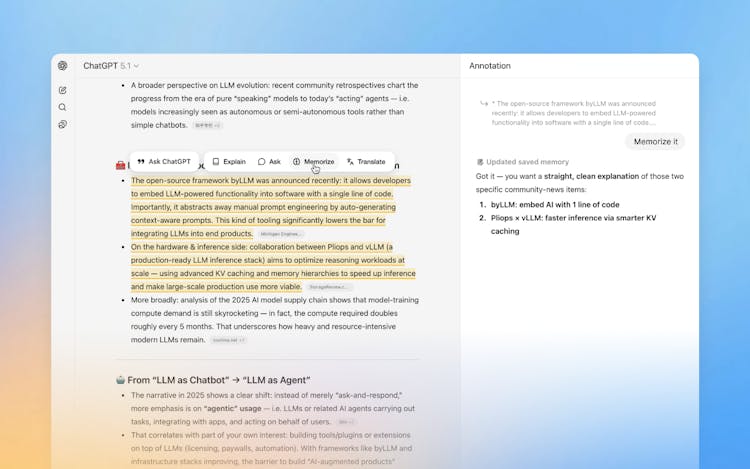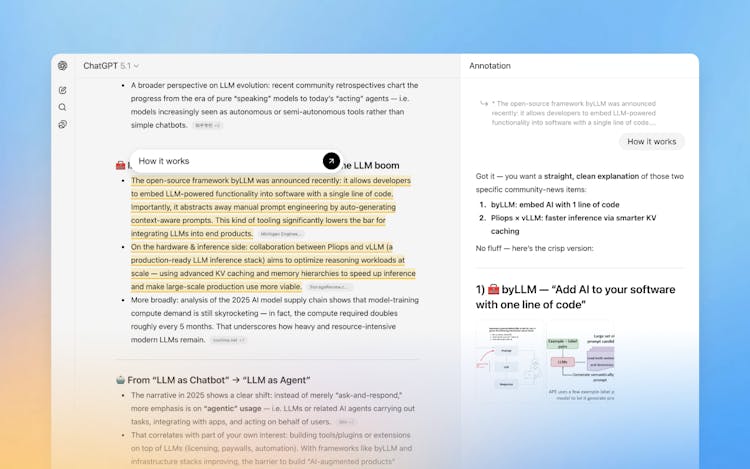 Thanks for checking out HighlightGPT! I built this because I constantly found myself scrolling through long ChatGPT replies, trying to re-find specific lines of code, error messages, or API details. With HighlightGPT, you can simply highlight any snippet inside ChatGPT — a stack trace, a config file line, a regex, or even a weird model output — and instantly ask a follow-up question. The answer appears in a clean side panel, so your main thread stays intact for context. It’s been super useful for: debugging unfamiliar code asking deeper questions about specific lines comparing two snippets without opening new chats learning new frameworks & APIs faster If you try it, I’d love to hear how it fits into your workflow—especially your dev/debugging use cases!