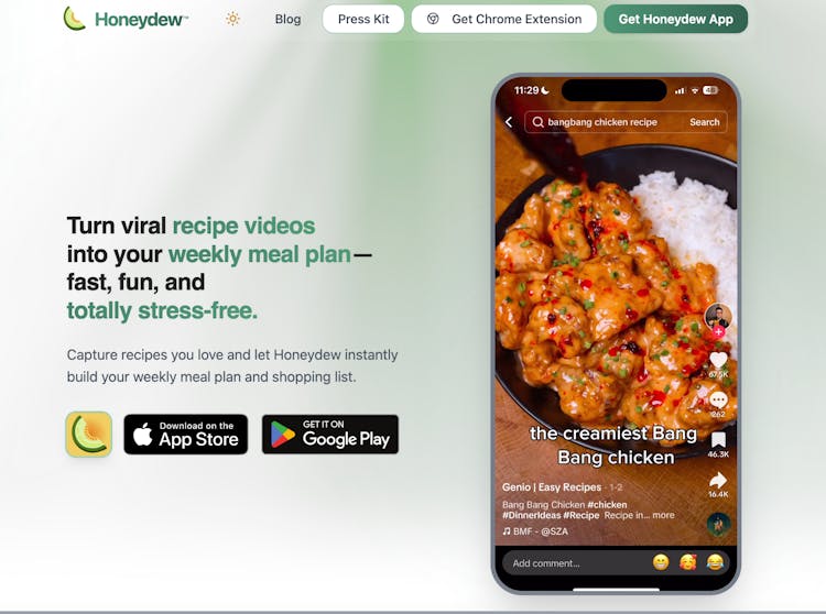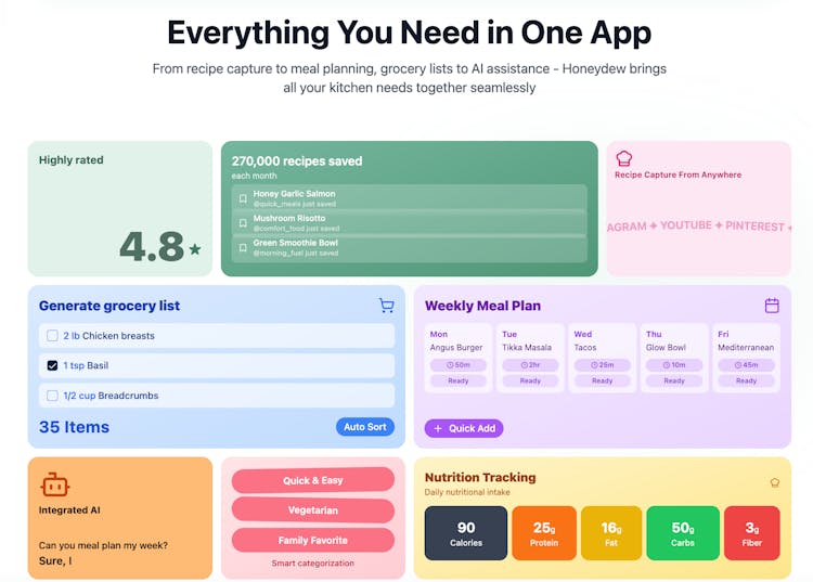 Honeydew is a digital recipe hub that brings together meal planning, shopping, and cooking. Save recipes from anywhere and let AI handle the planning.