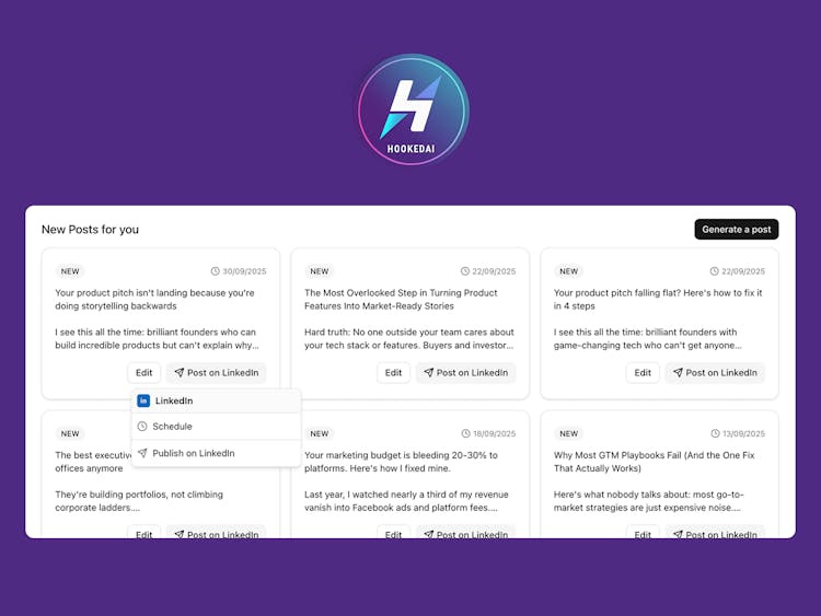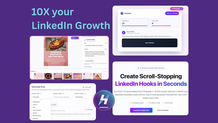 - Save hours on content creation: HookedAI instantly turns ideas into high-performing LinkedIn posts, hooks, and headlines — so you can stay consistent without spending hours writing.