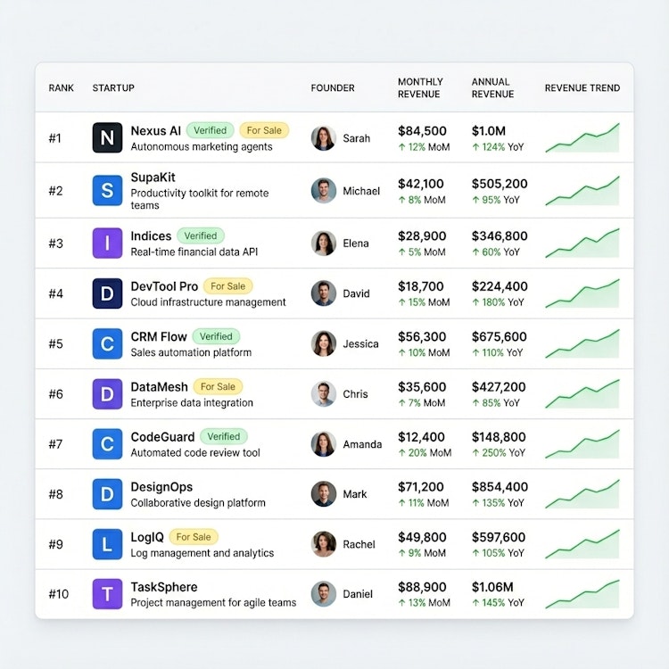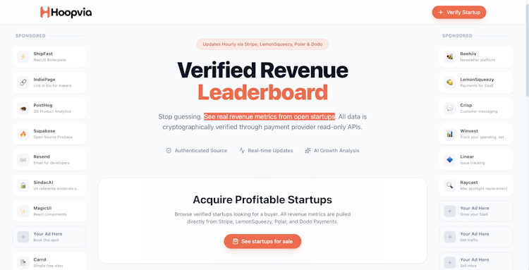 Hoopvia is a platform that ranks startups using verified revenue data through read-only APIs. No fake screenshots, no hype. Connect your read-only Stripe key, get a verified startup page, join the leaderboard, and get visibility with real buyers. Plus, monthly interviews with top founders to learn how they grew. A community built on proof and inspiration, not vanity metrics.