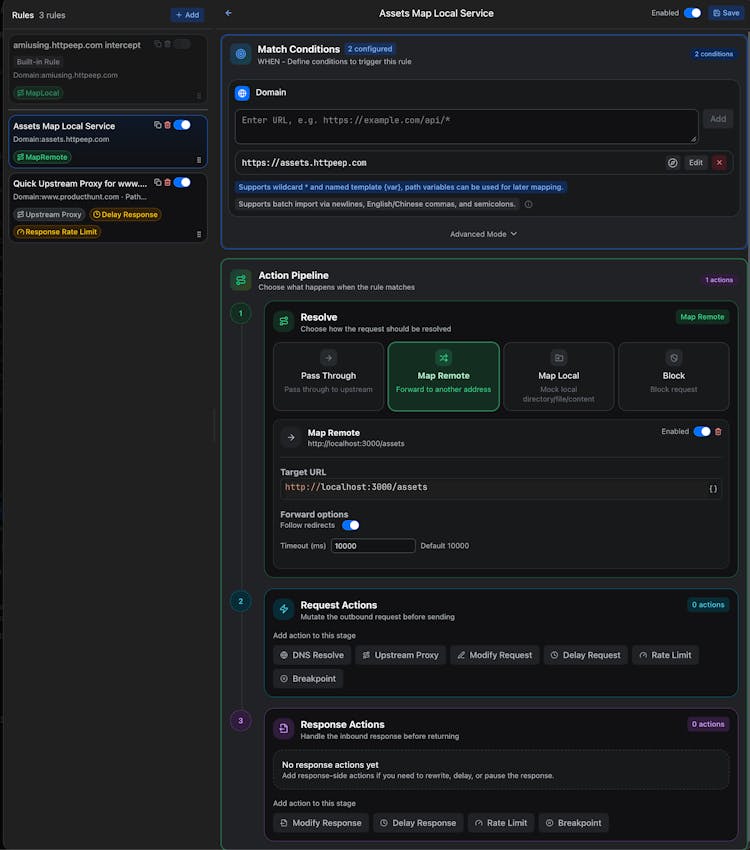 Request & Response Rewrite: Modify headers, body, status codes, delay, or any part of the traffic on the fly.