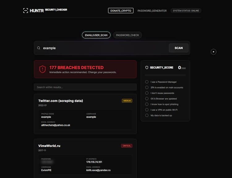 Huntr is a free security tool for auditing compromised credentials. It aggregates data from HaveIBeenPwned, XposedOrNot, and LeakCheck.io into a single search, including a client-side password generator. Built by a student dev for the security community.