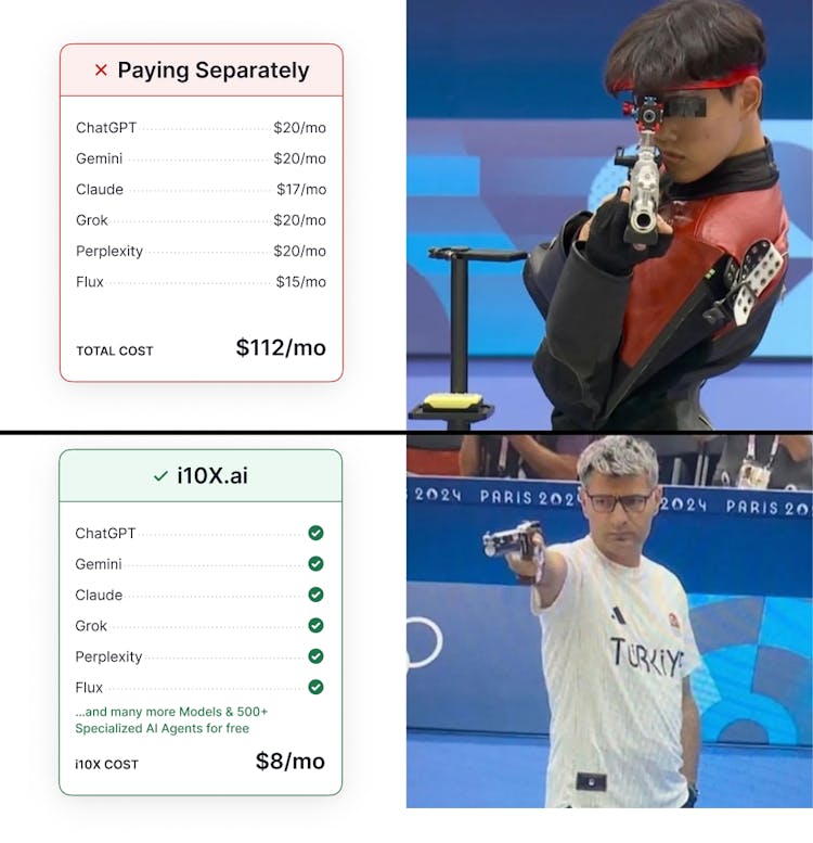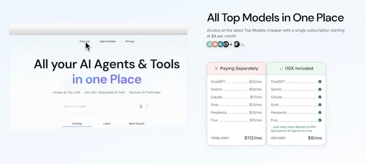 i10X.ai gives you full access to ChatGPT, Claude, Gemini, Perplexity & 500+ AI tools — all in one place, starting at just $8.
